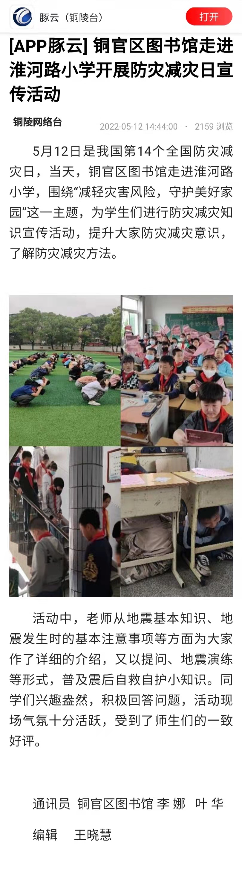 铜官区图书馆走进淮河路小学开展防灾减灾日宣传活动