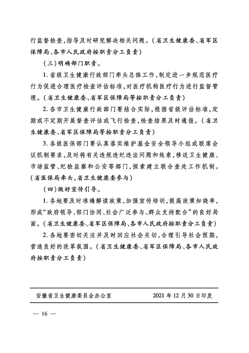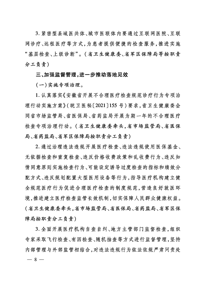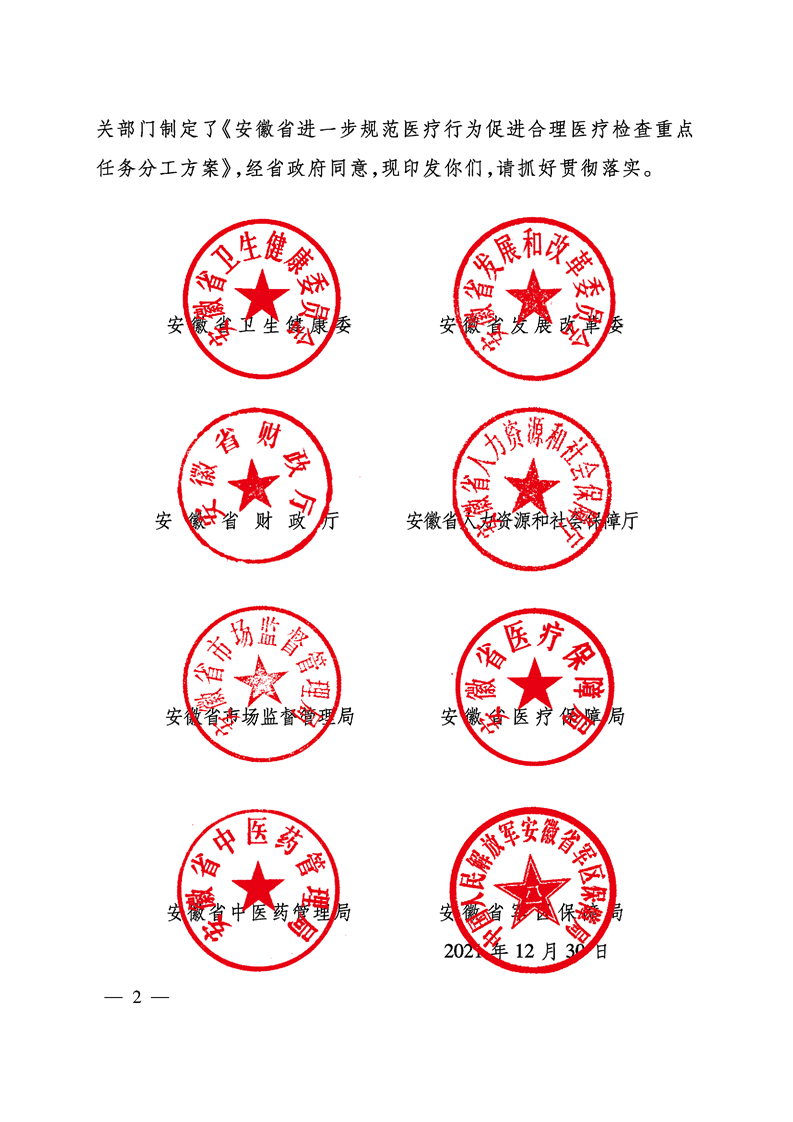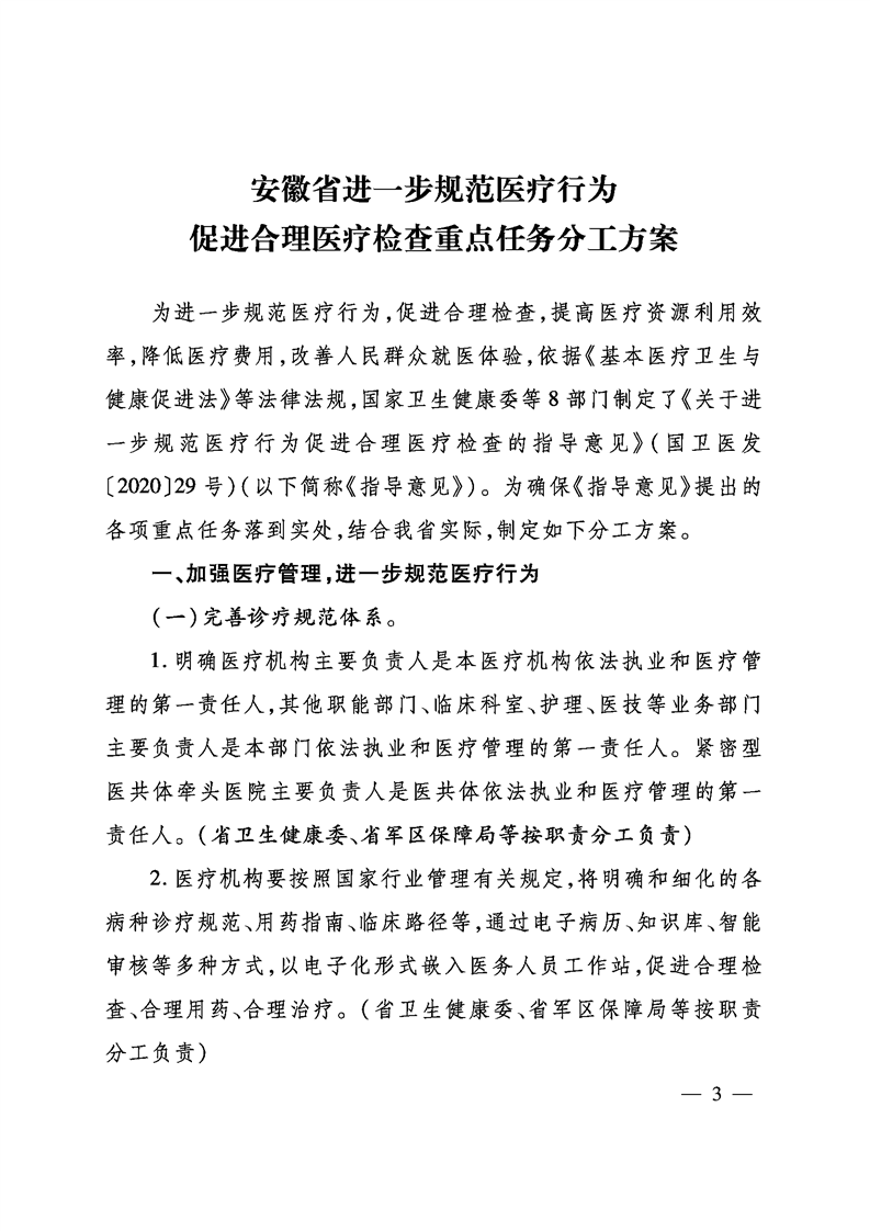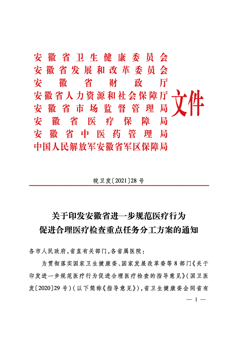 【地方政策文件】《关于印发安徽进一步规范医疗行为促进合理医疗检查重点任务分工方案的通知》(皖卫发〔2021〕28号)