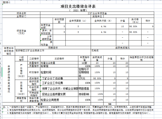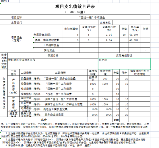 2021年度经信局部门整体支出绩效评价总分为100分,其中:产出指标实现情况50分,效益指标实现情况30分,满意度指标实现情况20分;经自评,总得分为90分,评价结果为优秀(评价说明:90(含)-100分为优、80(含)-90分为良、60(含)-80分为中、60分以下为差),具体情况如下: