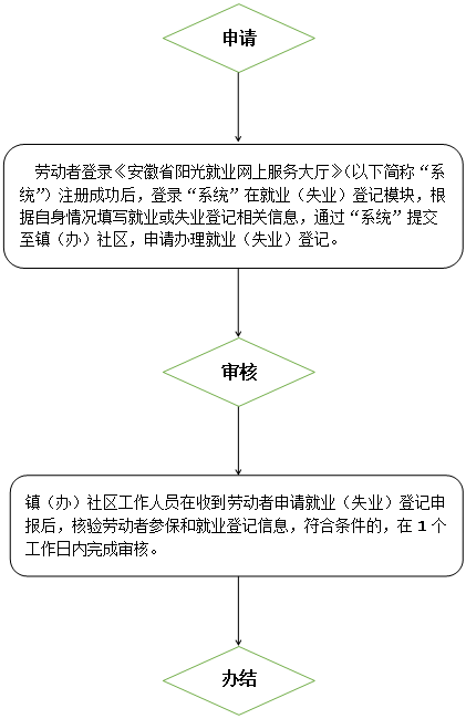 办事流程:劳动者登录《安徽省阳光就业网上服务大厅》(以下简称“系统”)注册成功后,登录“系统”在就业(失业)登记模块,根据自身情况填写就业或失业登记相关信息,通过“系统”提交至镇(办)社区,申请办理就业(失业)登记-------符合条件的,镇(办)社区工作人员在1个工作日内完成审核。