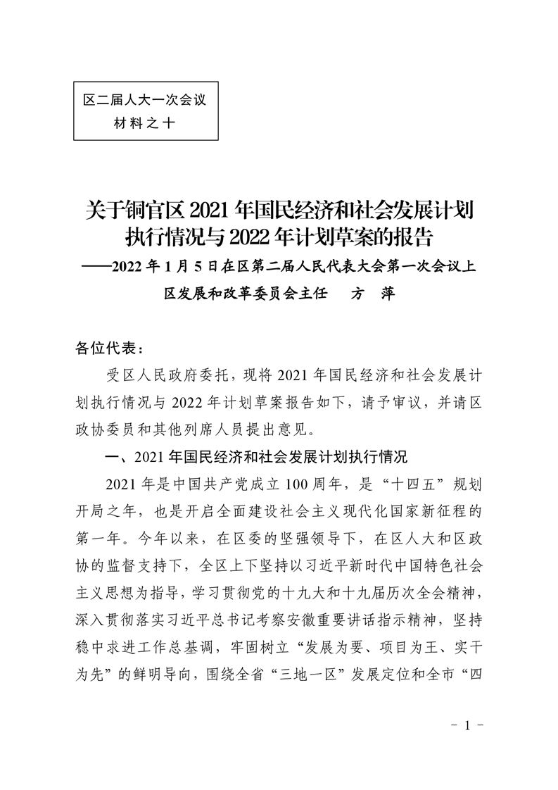 关于铜官区2021年国民经济和社会发展计划执行情况与2022年计划草案的报告