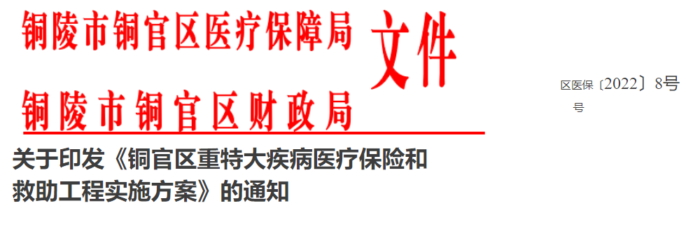为贯彻落实安徽省医保局《重特大疾病医疗保险和救助工程实施方案》和《铜陵市重特大疾病医疗保险和救助工程实施方案》(铜医保办〔2022〕24)号等文件要求,认真做好我区重特大疾病患者医疗保障工作,现将《铜官区重特大疾病医疗保险和救助工程实施方案》印发给你们,请认真遵照执行。