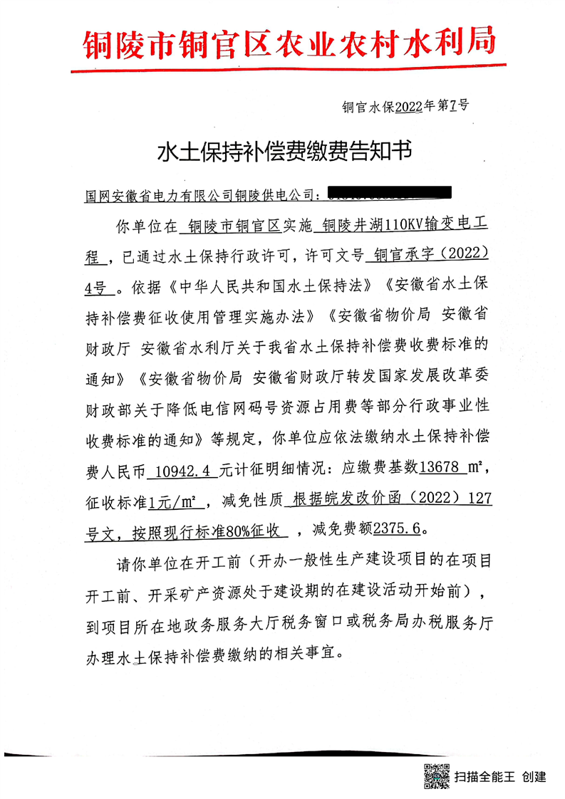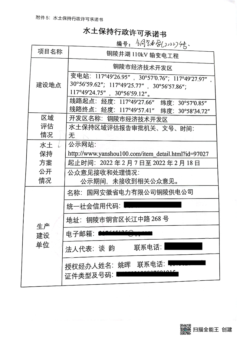 承诺4号 井湖输变电工程承诺书和水土保持补偿费告知书(-铜官区人民政府