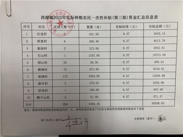 <惠民惠农>西湖镇2022年第三批实际种粮农民一次性补贴资金汇总信息表