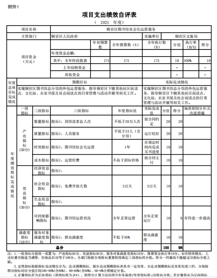 文旅局在2021年度部门决算中公开“铜官区图书馆社会化运营服务”1个项目绩效自评结果。