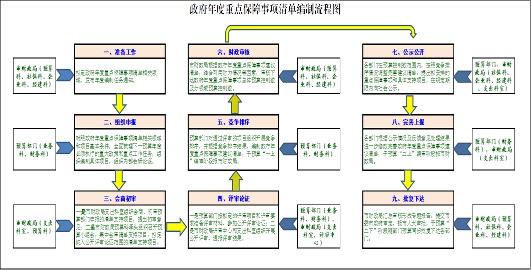 6. 报批下达。各部门根据公示情况及反馈意见处理结果进一步修改完善政府年度重点保障事项建议清单,于预算“二上”编审阶段报送市财政局。市财政局汇总审核形成专题报告,提交市委市政府审定,报市人大审批,于预算“二下”阶段随部门预算同步批复下达各部门。