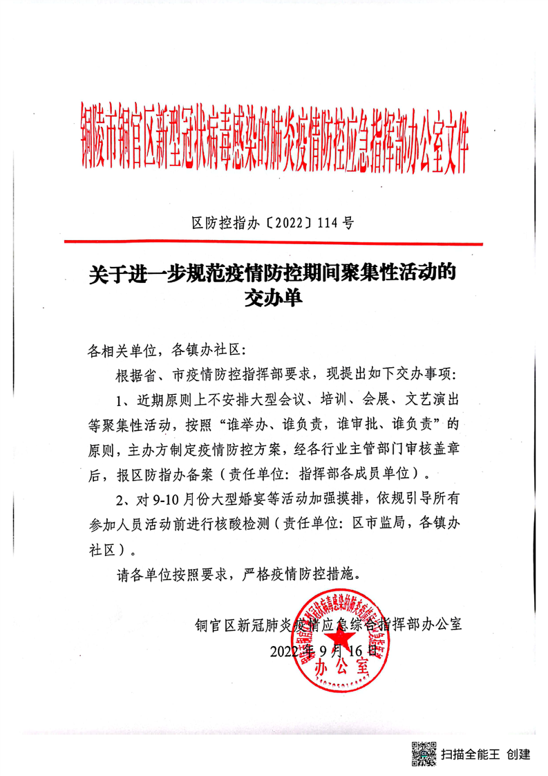 关于进一步规范疫情防控期间聚集性活动的交办单-铜官区人民政府