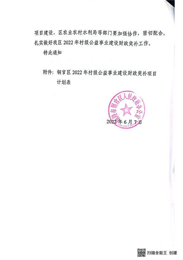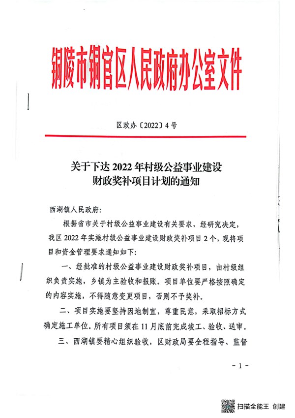 关于下达2022年村级公益事业建设财政奖补项目计划的通知-铜官区人民政府