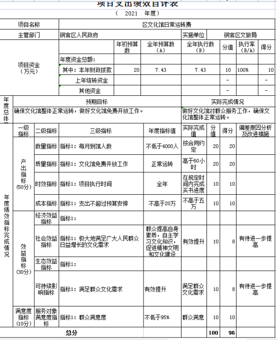 截至2021年底,共支付区文化馆日常运转费7.43万元,绩效目标总体完成情况良好。