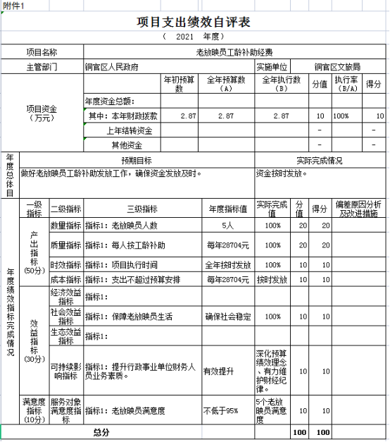 截至2021年底,共支付老放映员工龄补助经费2.87万元,绩效目标总体完成情况良好。
