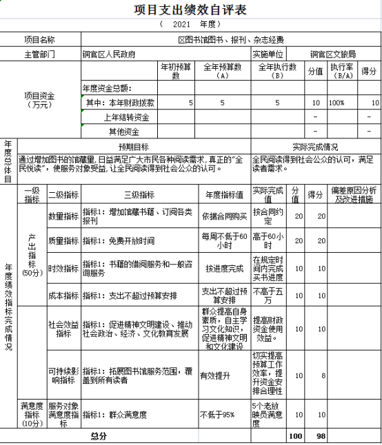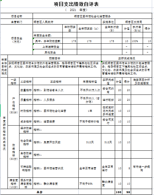 截至2021年底,共支付区铜官区图书馆社会化运营服务费175万元,绩效目标总体完成情况良好。