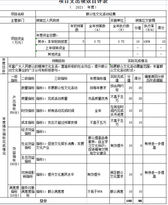 截至2021年底,共支付区群众性文化活动经费3.72万元,绩效目标总体完成情况良好。