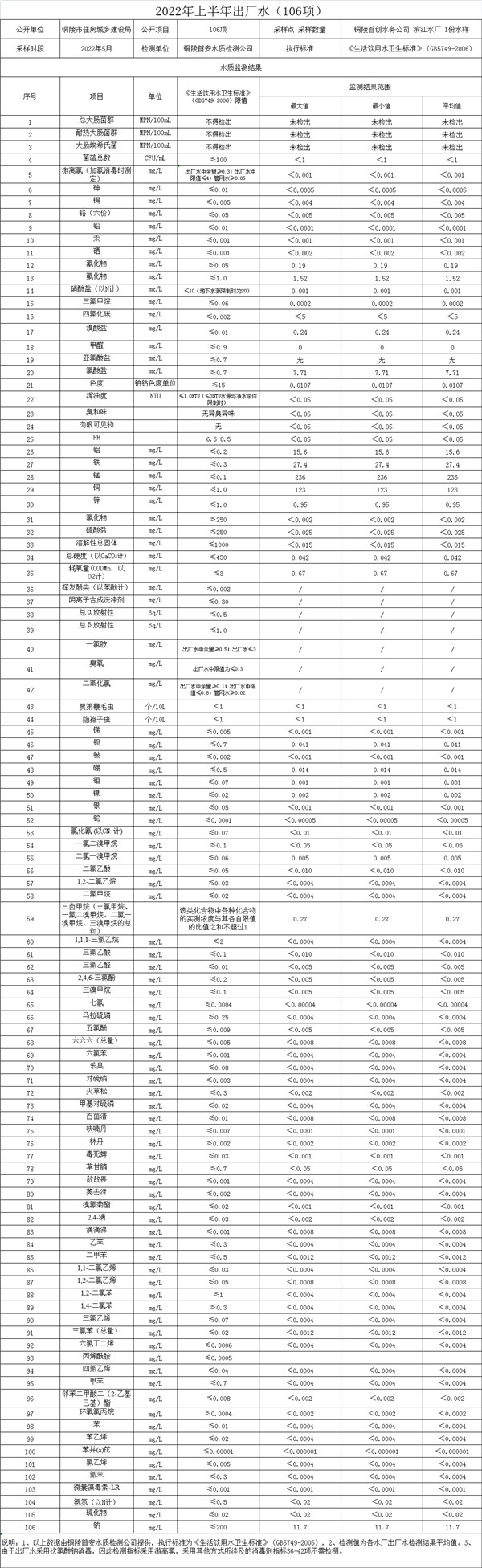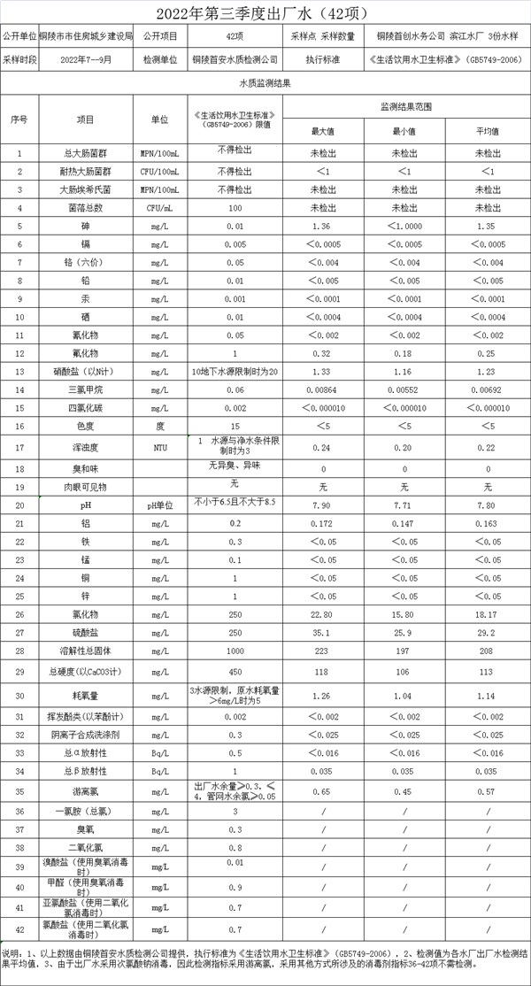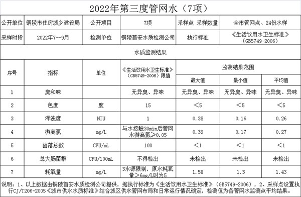 根据省住建厅《关于进一步规范城市公共供水水质信息公开工作的通知》(建城函【2020】1132号)文件要求,现将铜陵市2022年第三季度城区生活饮用水卫生监测结果公告如下: