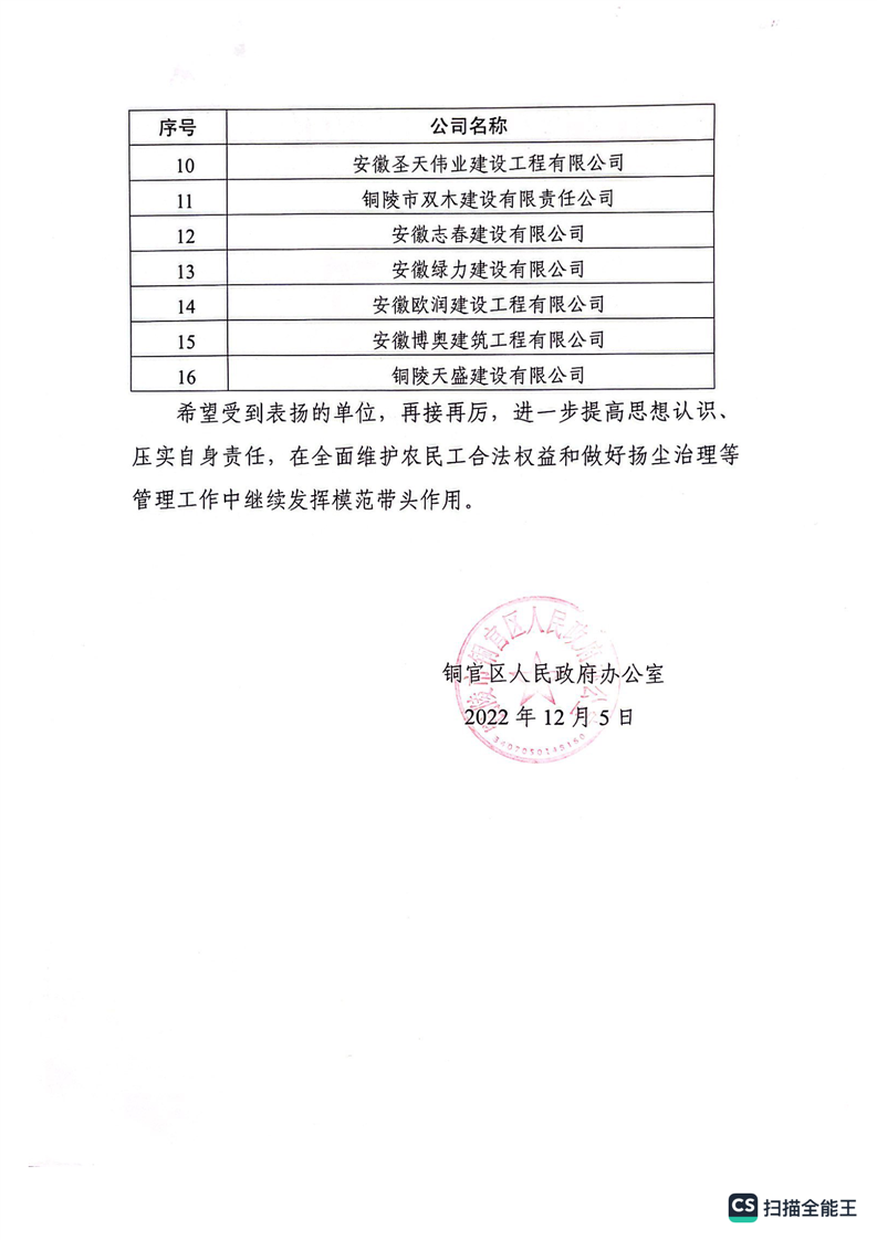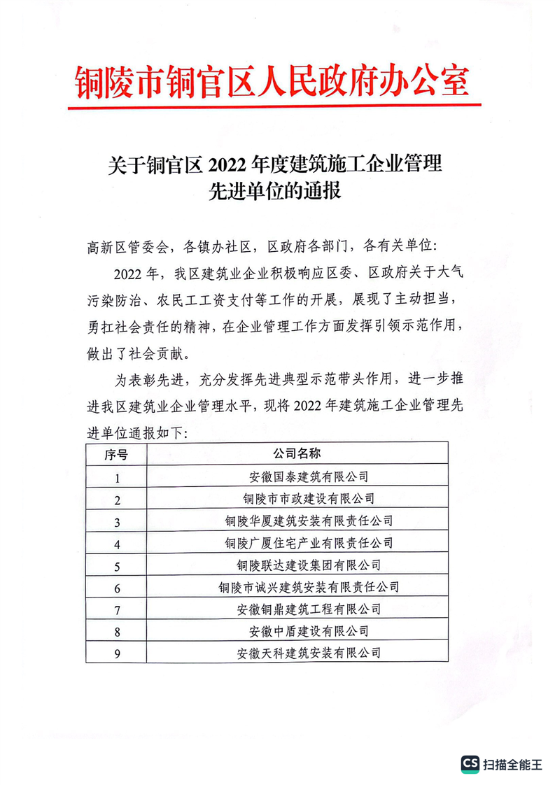 关于铜官区2022年度建筑施工企业管理先进单位的通报-铜官区人民政府