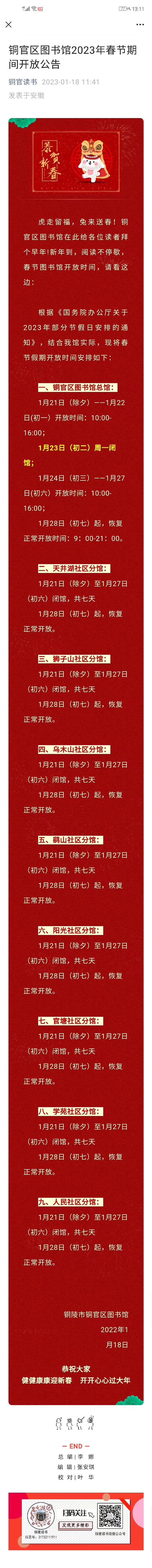铜官区图书馆2023年春节期间开放公告-铜官区人民政府