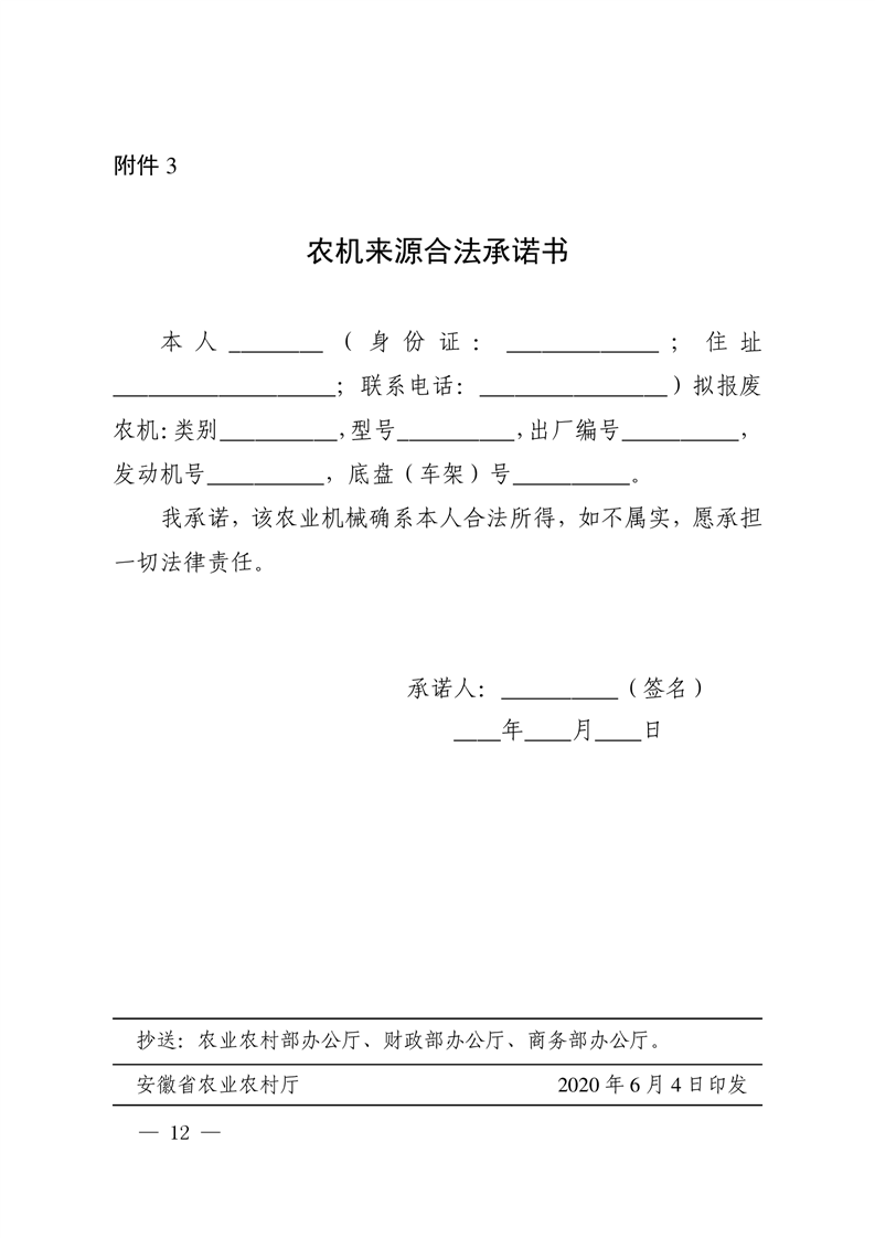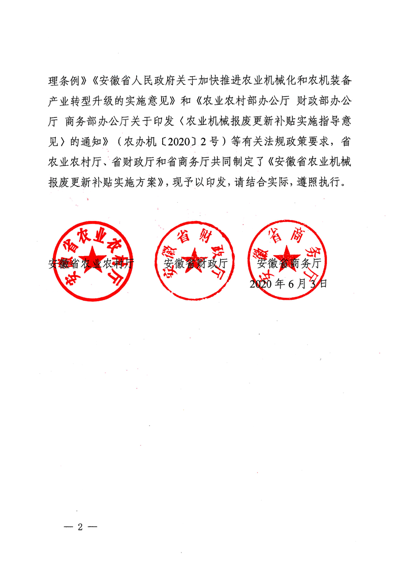 安徽省农业农村厅 安徽省财政厅 安徽省商务厅关于印发安徽省农业机械报废更新补贴实施方案的通知