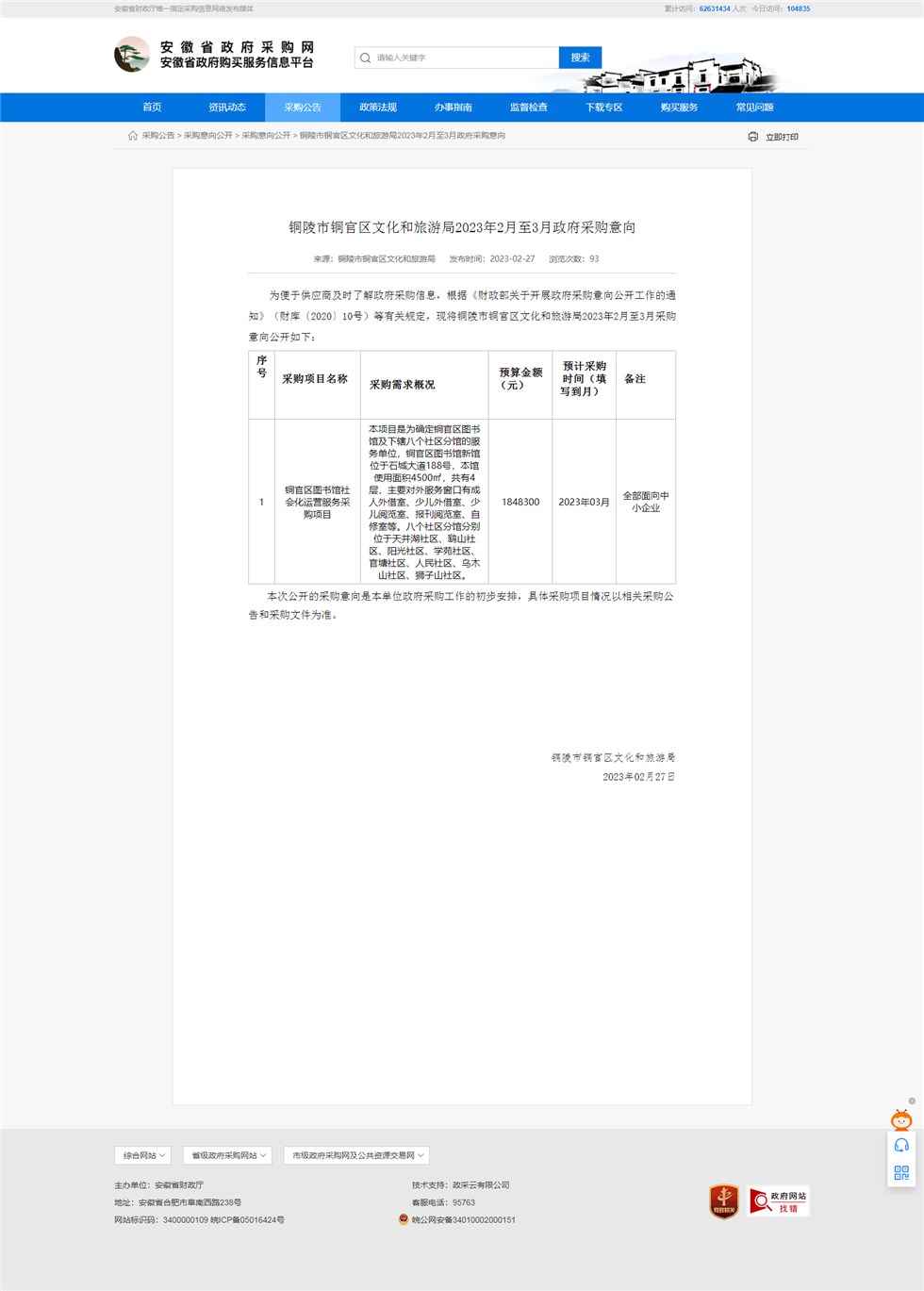 铜陵市铜官区文化和旅游局2023年2月至3月政府采购意向-铜官区人民政府