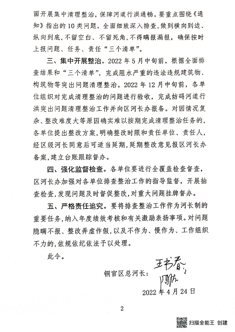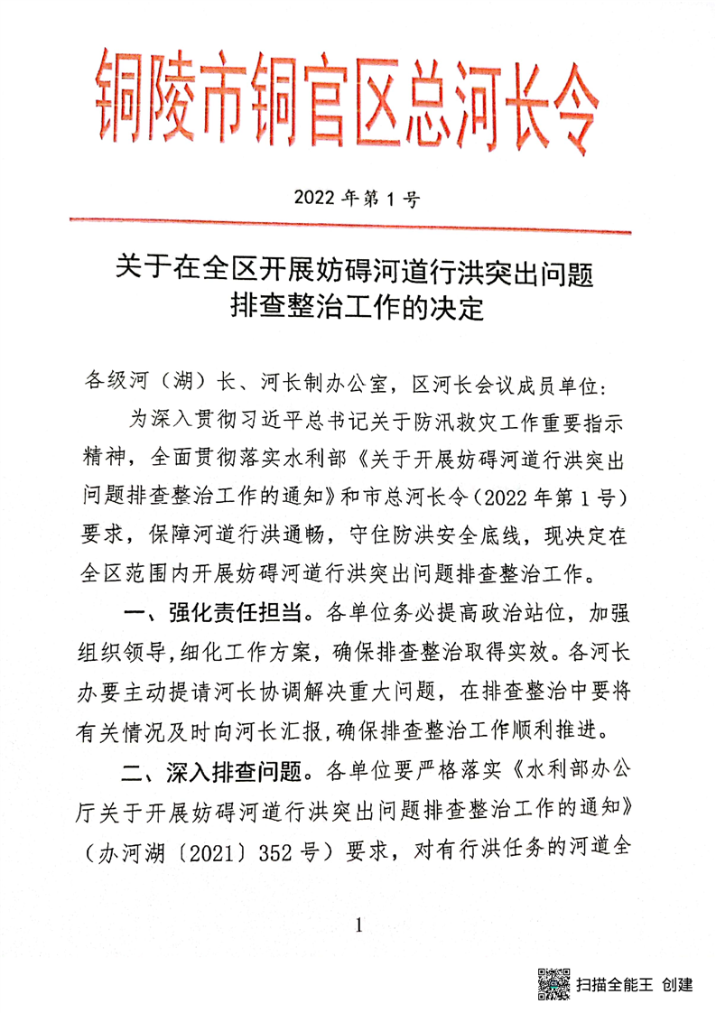 关于在全区开展妨碍河道行洪突出问题排查整治工作的决定-铜官区人民政府