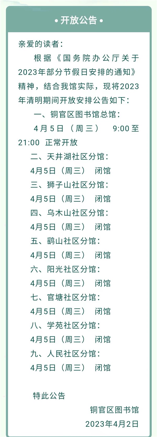 铜官区图书馆2023年清明期间开放时间公告-铜官区人民政府