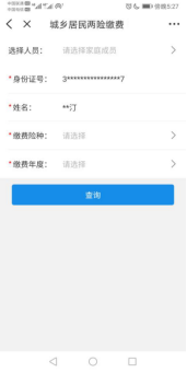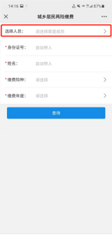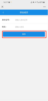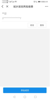 打开“城乡居民两险缴费”功能页面后,点击“选择人员”(如图3),打开参保人员选择页面。在此页面点击下方的“添加成员”按钮(如图4)。在打开的成员添加页面,输入新的参保缴费人的身份证号码与姓名,然后点击“保存”按钮(如图5)。