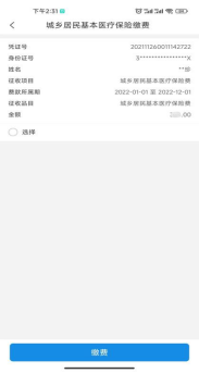 打开“城乡居民两险缴费”功能页面后,点击“选择人员”(如图3),打开参保人员选择页面。在此页面直接点击参保人姓名或身份证号码(如图6),即可选中本次缴费的参保人。系统自动返回上一缴费页面(如图7)。在此处点击“缴费险种”栏后的箭头符号,打开险种选择页面(如图8)。
