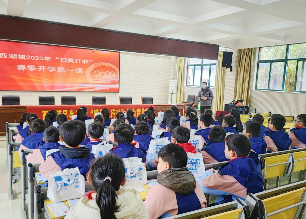 为维护校园纯净文明的育人环境,促进学生健康成长,新学期伊始,2月8日上午,西湖镇“扫黄打非·春季开学第一课”进校园活动在西湖中心小学举办。