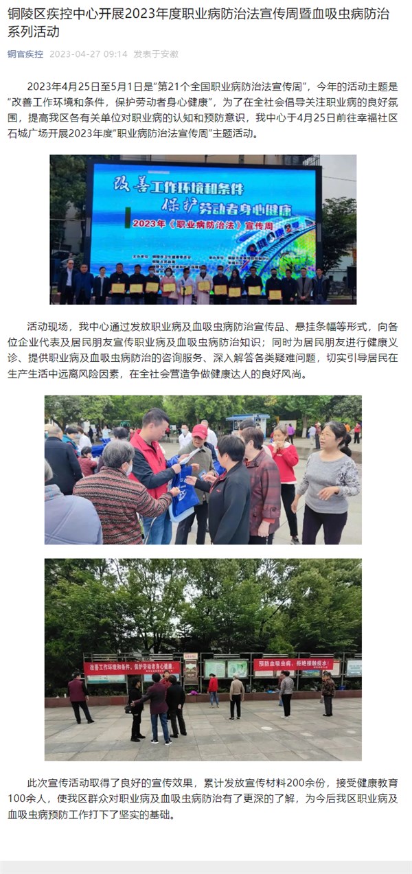 铜陵区疾控中心开展2023年度职业病防治法宣传周暨血吸虫病防治系列活动-铜官区人民政府