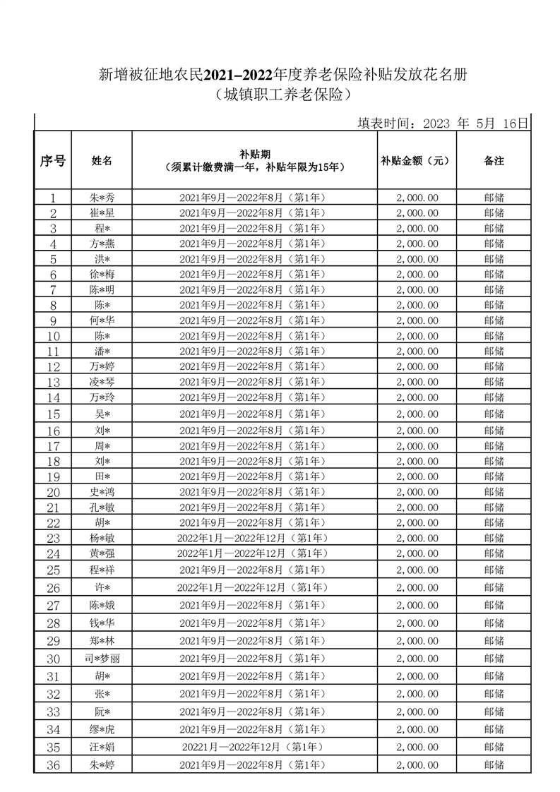 新增被征地农民2021-2022年度养老保险补贴发放花名册 (城镇职工养老保险)