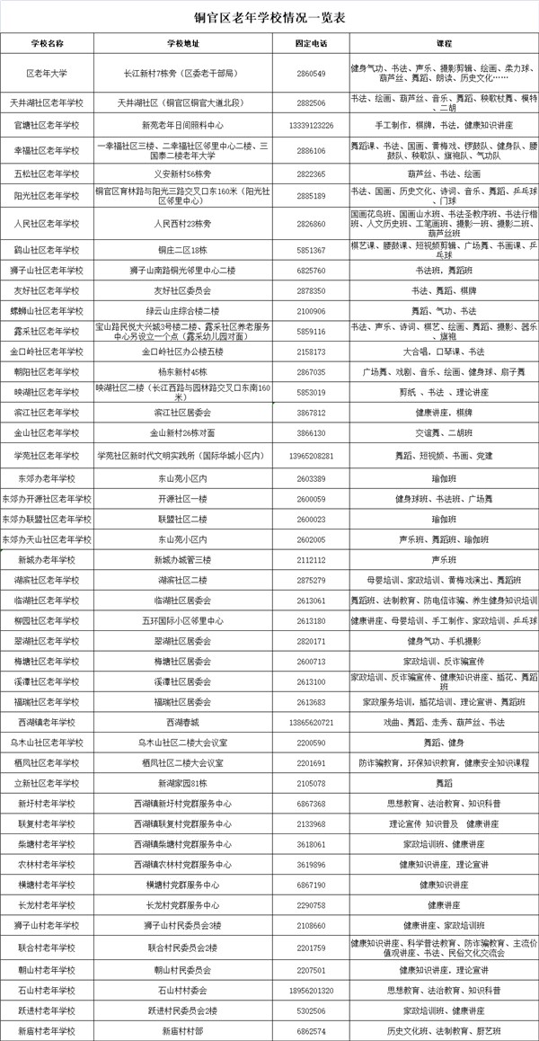 老年朋友可以根据自己的兴趣和需求,选择学习健康养生、摄影制作、智能手机使用等实用技能课程,也可选择书法、舞蹈、棋艺、球类、广场舞等文体课程。铜官区三级老年学校开设了丰富多彩的活动课程,具体活动课程详见附表。