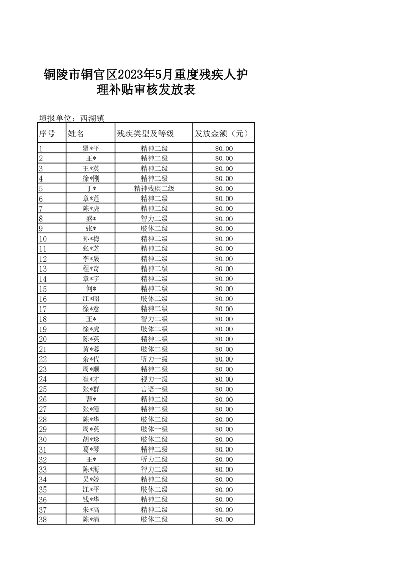 西湖镇2023年5月重度残疾人护理补贴审核发放表-铜官区人民政府