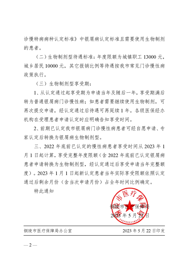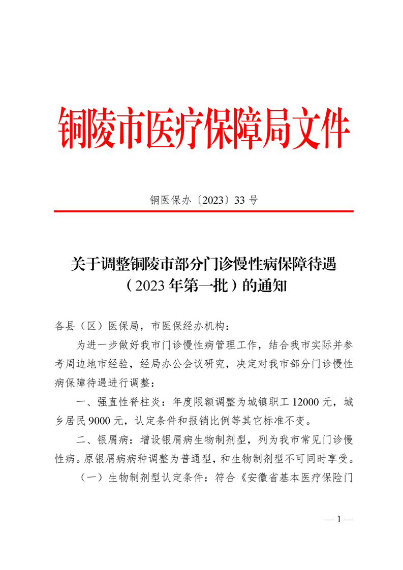 铜医保办〔2023〕33号——关于调整铜陵市部分门诊慢性病保障待遇(2023 年第一批)的通知-铜官区人民政府
