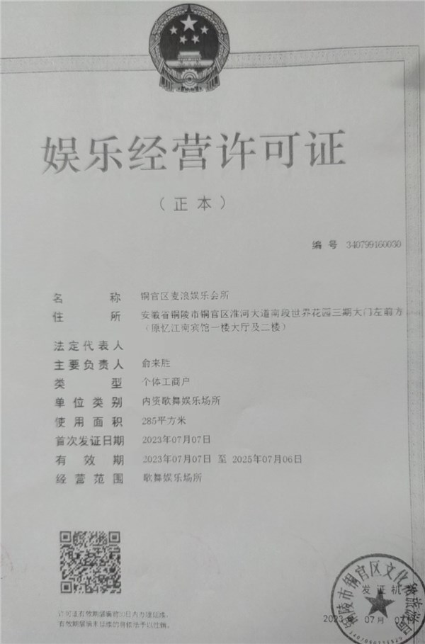 歌舞娱乐场所新设(铜官区麦浪娱乐会所)-铜官区人民政府