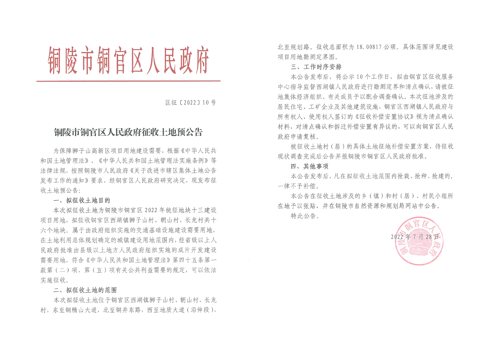 铜陵市铜官区人民政府征收土地预公告【铜陵市2023年第1批次城市建设用地项目】区征【2022】10号-铜官区人民政府