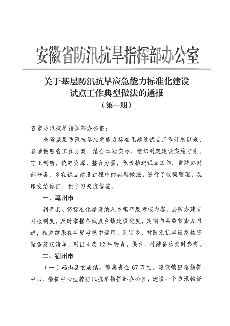 转发省防办《关于基层防汛抗旱应急能力标准化建设试点工作典型做法的通报(第一期)》
