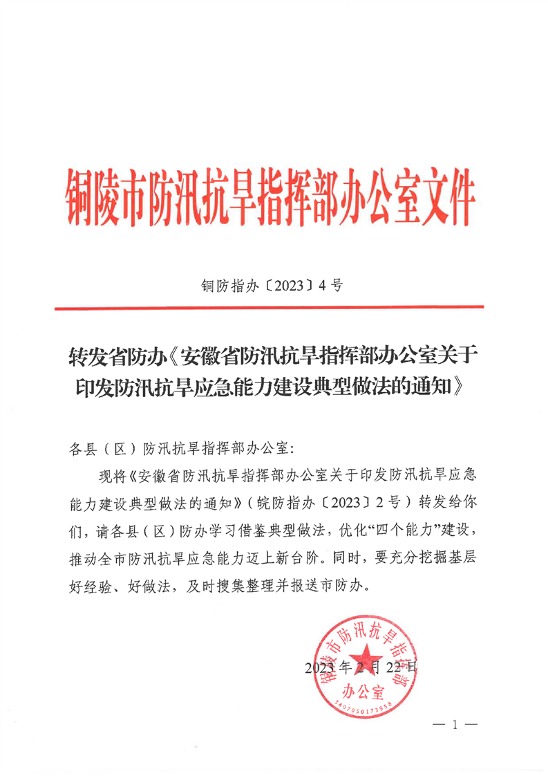 转发省防办《安徽省防汛抗旱指挥部办公室关于印发防汛抗旱应急能力建设典型做法的通知》-铜官区人民政府