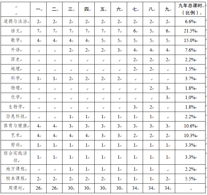 一至二年级每周26课时,三至六年级每周30课时,七至九年级每周34课时,九年新授课总课时数为9522。小学每课时按40分钟计算,初中每课时按45分钟计算。
