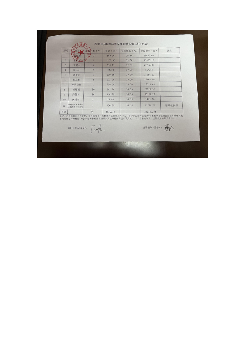 西湖镇2023年稻谷补贴资金汇总信息表-铜官区人民政府