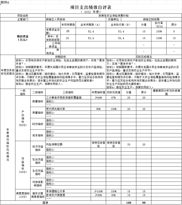 (一)项目概况。依据省财政厅《关于做好2022年度中央对地方转移支付预算执行情况绩效自评工作的通知》(皖财绩〔2022〕297号)文件要求,对铜官区2022年度创业担保贷款贴息预算执行绩效自评工作。2022年我区农业保险保费补贴全年预算资金为1210万元。其中:中央预算资金466万元,省级资金433万元,地方预算资金311万元。