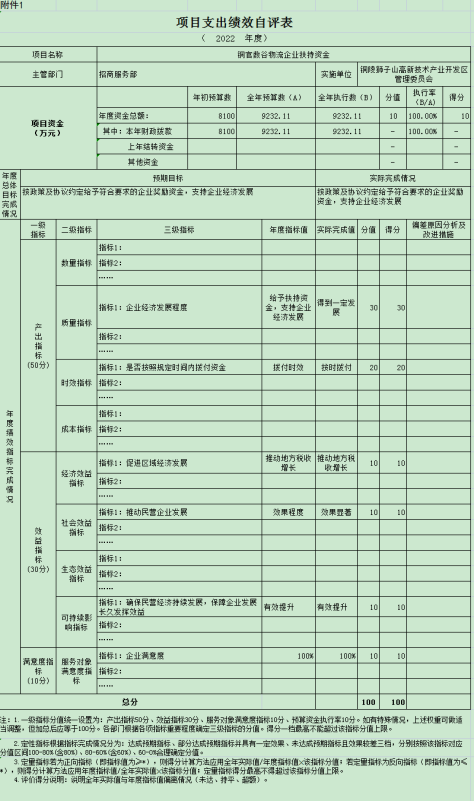 根据预算绩效管理要求,本部门组织对2022年度纳入部门预算的项目支出全面开展了绩效自评,共2个项目,涉及资金8623万元,占项目预算总额的100%。从评价情况看,铜官区狮子山高新区按照要求开展部门项目绩效自评工作,其中铜官数谷物流企业扶持资金项目预算总金额是8100万元。此项目主要是按政策及协议约定给予符合要求的企业奖励资金,支持企业经济发展,达到了预期绩效目标;人员相关支出项目预算总金额是523万元。此项目主要是为推进园区高质量发展,狮子山高新区深化体制机制改革,全面提升狮子山高新区综合发展水平。完善绩效薪酬制度,实行目标考核总额控制,根据贡献率、任务量等因素综合确定岗位薪酬标准,设定与工作任务目标相对应的绩效工资,达到了预期绩效目标。
