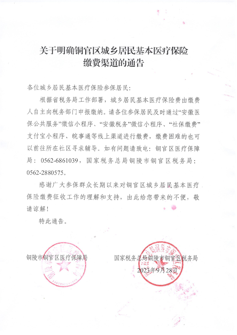 关于明确铜官区城乡居民基本医疗保险缴费渠道的通告-铜官区人民政府