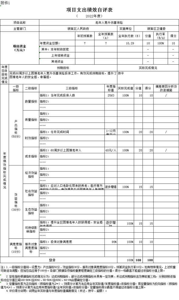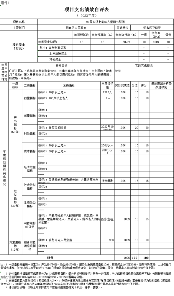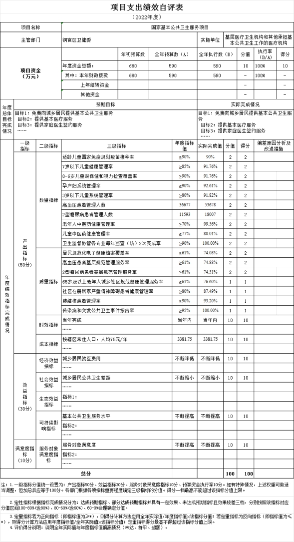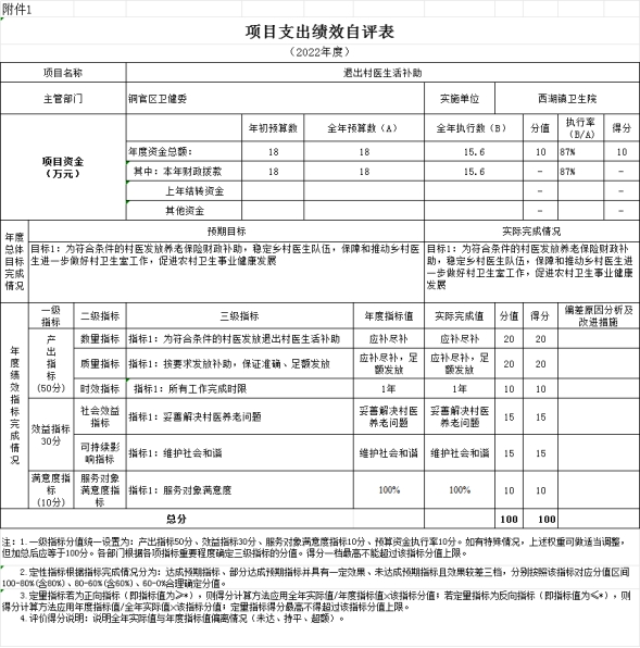 根据预算绩效管理要求,本部门组织对2022年度纳入部门预算的项目支出全面开展了绩效自评,共18个项目,涉及资金1859.22万元,占项目预算总额的52.6%。从评价情况看,基本完成预算绩效目标,保障基本运行,基本完成全区各项卫生健康工作;完成退休人员计划生育一次性奖励及终生无子女人员一次性补助经费、基本公共卫生服务(家庭医生签约服务)、完成妇幼疾病筛查(含产筛)项目工作任务等工作。