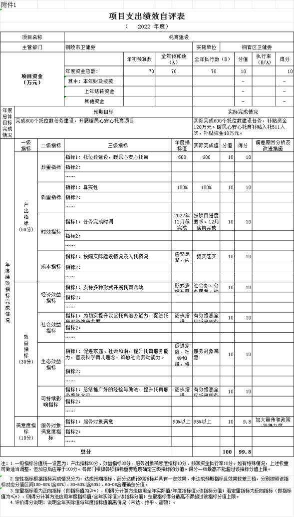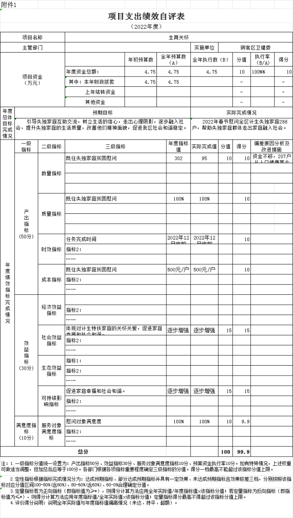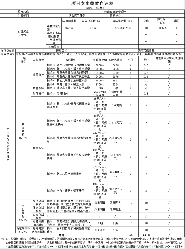 对照《部门预算项目支出绩效评价指标表》逐条进行自查自评,2022年度妇幼疾病筛查民生工程项目实施效果较好,有效的提升了妇女儿童健康水平,提高了出生人口素质,提升我区妇女儿童健康福利水平。妇幼疾病筛查项目综合自评得分为98.5分,自评为“优秀”。