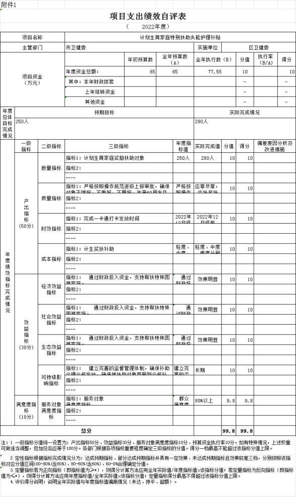 退休人员计划生育一次性奖励及终生无子女人员一次性补助经费绩效自评综述:根据年初设定的绩效目标,项目绩效自评得分为99分。全年预算400万,实际执行数253.15万元。完成预算的63.3%。项目绩效目标完成情况:严格按照实施方案逐级上报审批,确保对象不错报、不重报、不漏报。按照年度通过一卡通发放,通过财政投入资金,引导广大群众自觉实行计划生育,提高计划生育家庭发展能力,增强社会稳定性,促进社会和谐发展。