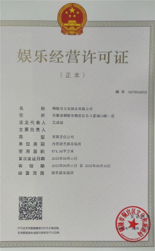 游艺娱乐场所新设(铜陵市文乐娱乐有限公司)-铜官区人民政府