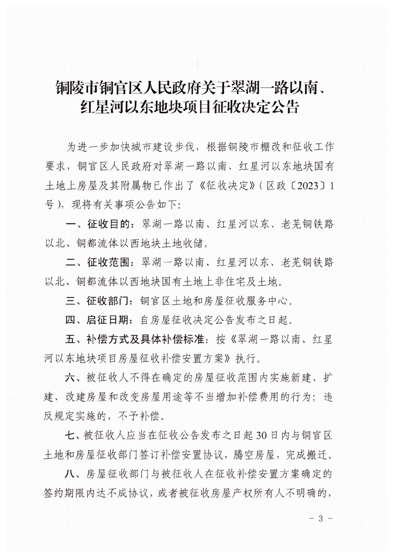 铜陵市铜官区人民政府关于翠湖一路以南、红星河以东地块项目征收决定
