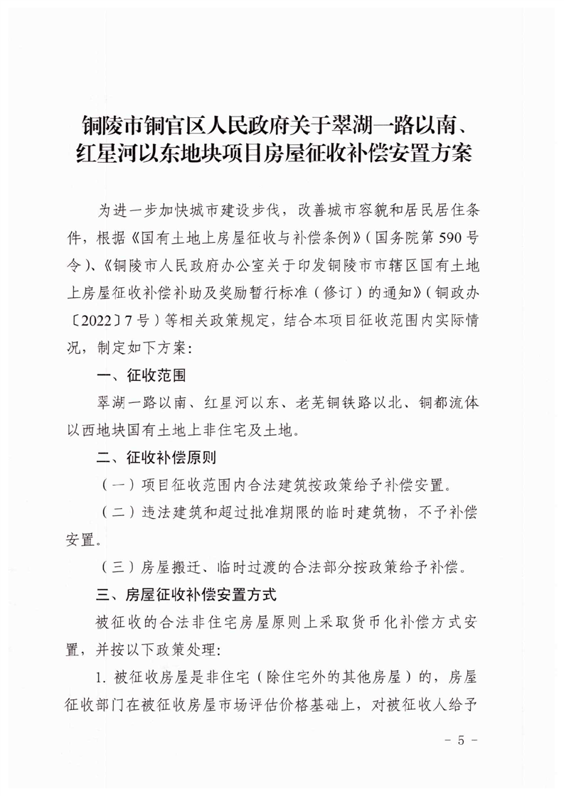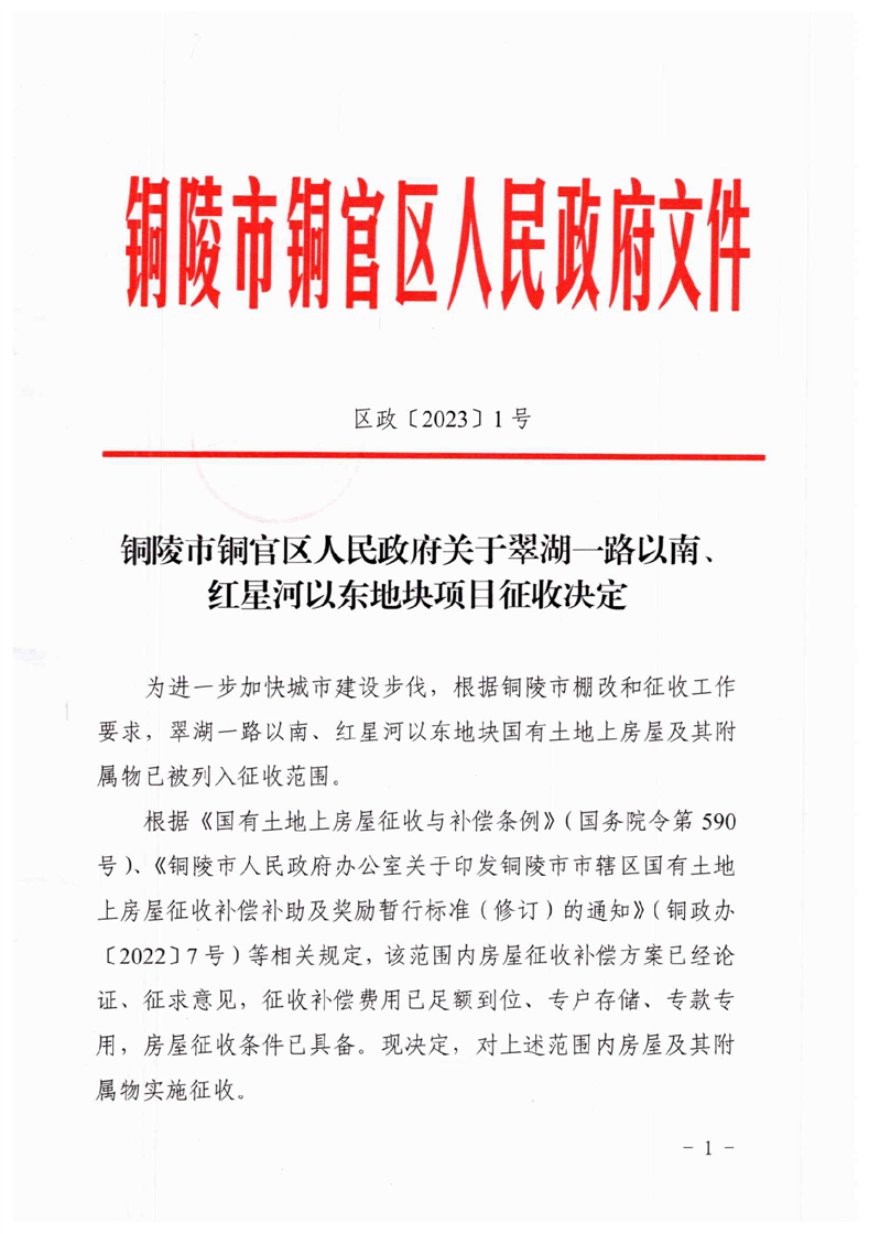 铜陵市铜官区人民政府关于翠湖一路以南、红星河以东地块项目征收决定-铜官区人民政府