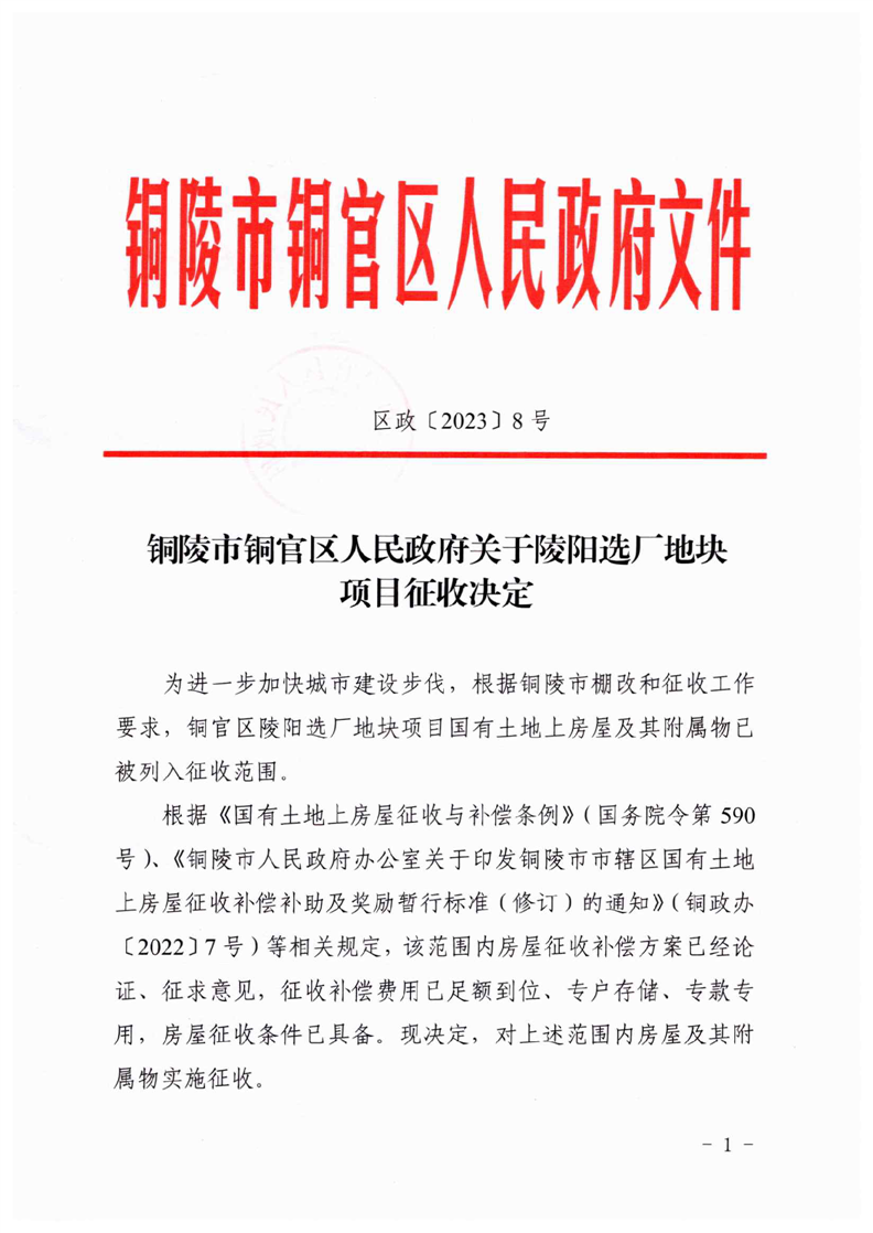 铜陵市铜官区人民政府关于陵阳选厂地块项目征收决定-铜官区人民政府
