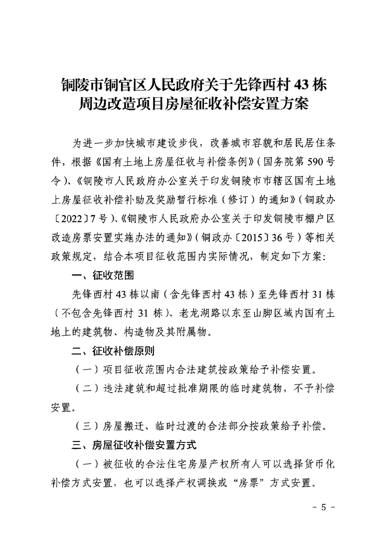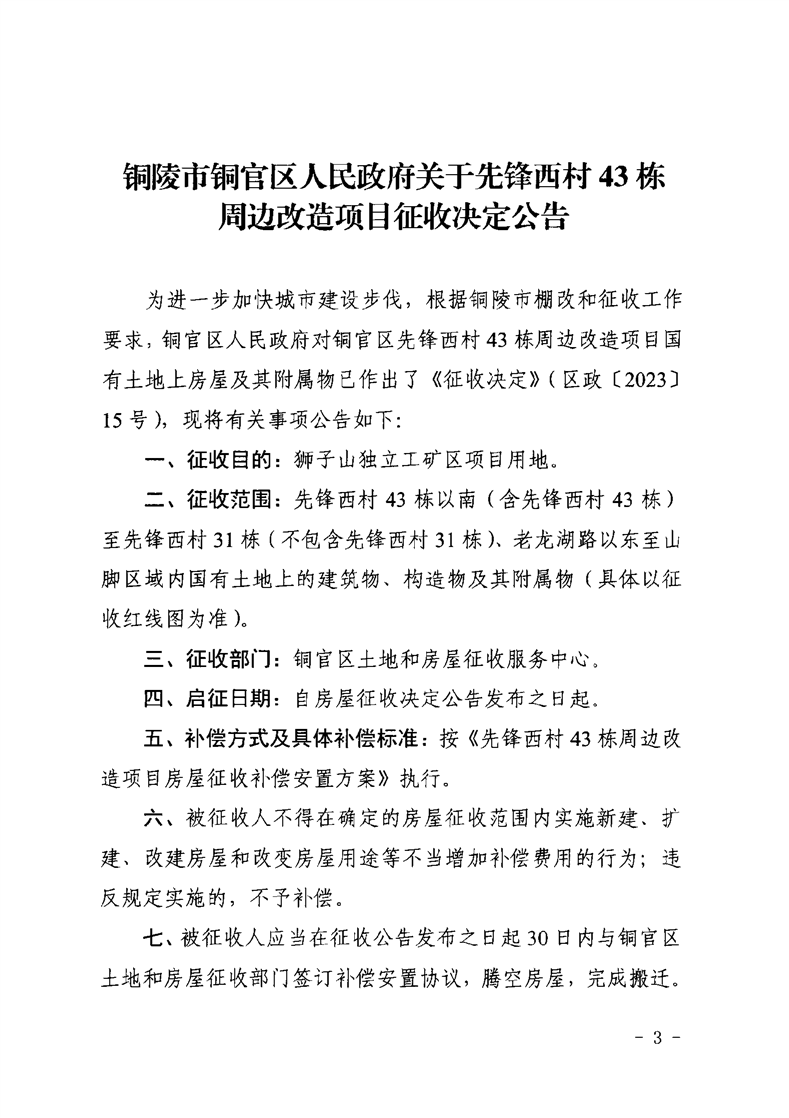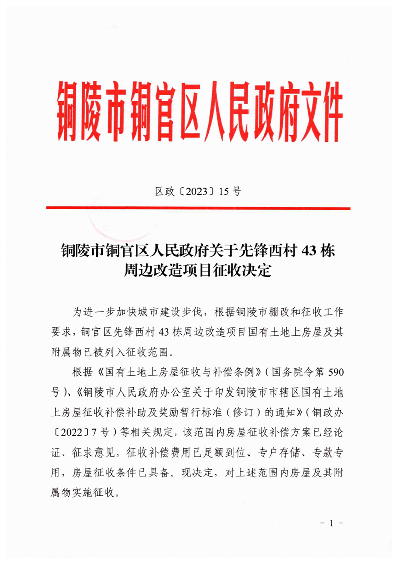 铜陵市铜官区人民政府关于先锋西村43栋周边改造项目征收决定-铜官区人民政府