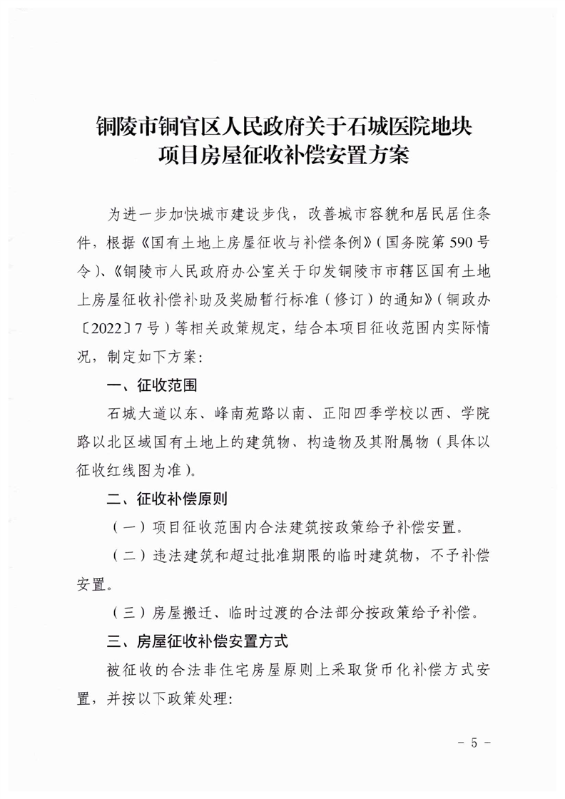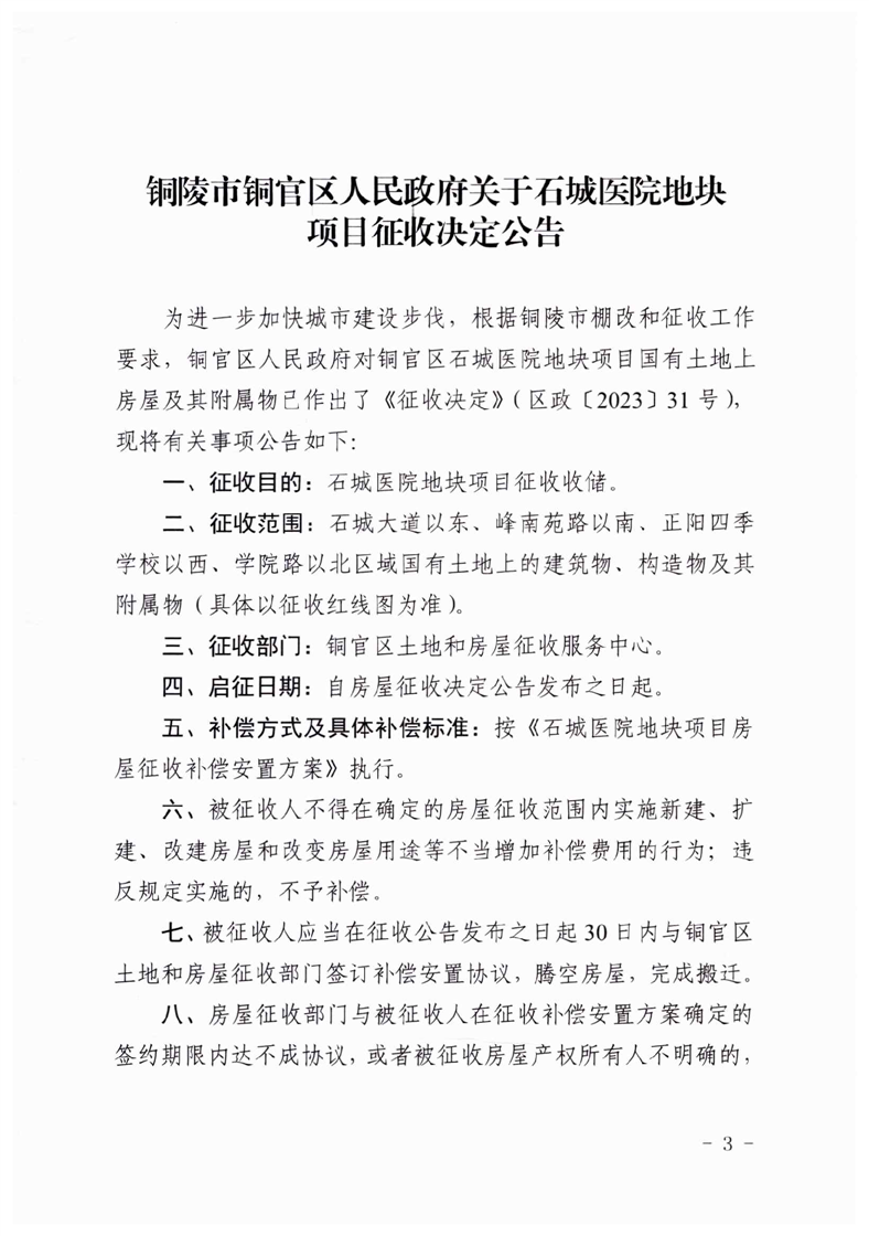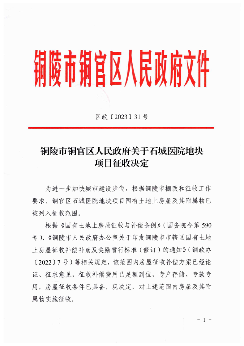 铜陵市铜官区人民政府关于石城医院地块项目征收决定-铜官区人民政府