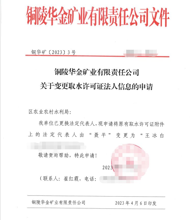 变更取水许可证法人信息——铜陵华金矿业有限责任公司-铜官区人民政府